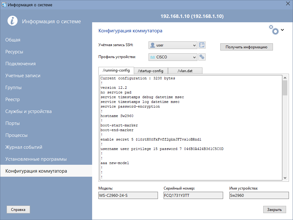 Вторая новость — LANState теперь умеет получать конфигурационные файлы коммутаторов по SSH. Речь о тех самых running-config, startup-config и vlan.dat.