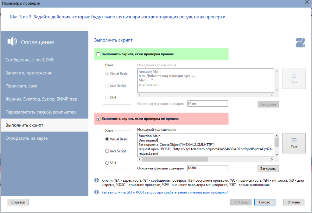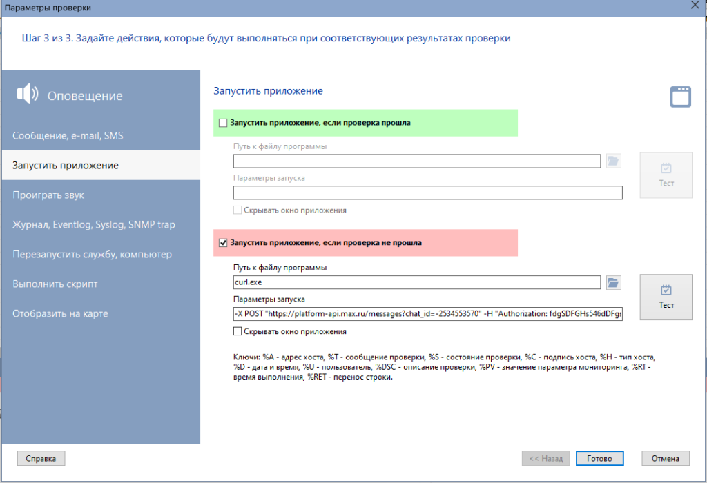 Второй способ делает тоже самое, но с помощью open source утилиты curl. В разделе оповещения Запустить приложения нужно в поле Путь к файлу программы указать curl.exe (если путь к ней прописан в переменных среды), а в поле Параметры запуска задать остальные параметры. Например, параметры для отправки в чат MAX через curl будут выглядеть так: