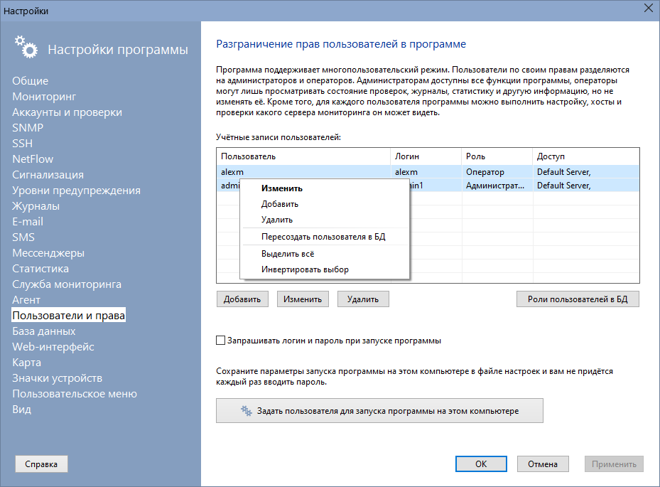 Мы добавили возможность изменять доступ к ресурсам программы мониторинга для нескольких пользователей. Для этого нужно выделить их в списке, выбрать в меню пункт Изменить, настроить тип доступа, права и применить общие настройки для выделенных пользователей.