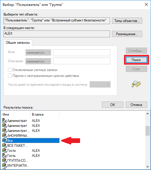и затем Поиск..., чтобы отобразить полный список пользователей системы. Выделите Все и нажмите ОК.