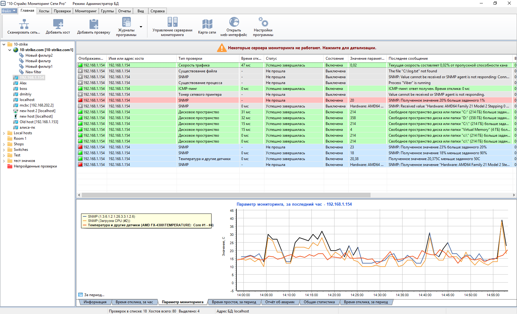 локальной сети для проверки критических параметров устройств - на коммутаторах и серверах. Контролируйте наличие свободного места на дисках, температуру ЦП и GPU, загрузку процессора, следите за доступностью и временем отклика служб и каналов связи. Российское ПО для импортозамещения!