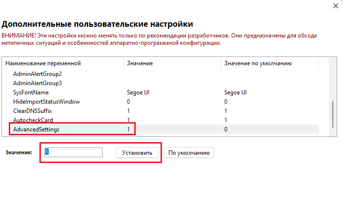 - Найдите переменную AdvancedSettings и установите значение 1.